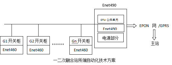 Enet490 一二次融合DTU公共單元和Enet460一二次融合三遙動(dòng)作型DTU間隔單元組成了一二次融合智能分布式DTU的實(shí)現(xiàn)方案: