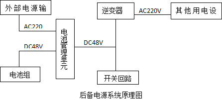 正常供電時(shí),由外部電源輸入,經(jīng)過電池管理單元提供開關(guān)的控制和操作電源,同時(shí)經(jīng)過逆變器,給網(wǎng)絡(luò)設(shè)備、視頻等其他用電設(shè)備等供電。外部電源同時(shí)給電池組充電;外部電源失電時(shí),由電池組通過電池管理單元自動(dòng)接續(xù),給開關(guān)回路和其他用電設(shè)備供電。